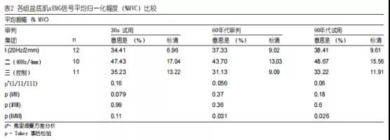 在90年代的试验中,盆底肌sEMG信号的中位和平均频率以及平均归一化幅度的绝对值(最终和初始子周期之间的差异)为负值,表明这些参数有所下降。然而,组间差异无统计学意义(p>0.05)(表4).Tukey事后检验也没有发现统计学上的显着差异。