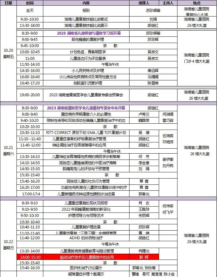 儿童肌张力障碍的管理策略;重症病例早期康复介入的必要性;ADHD的门诊建设;脑瘫儿童痉挛的多学科管理;护理领导力与领导艺术;儿骨科术后康复护理各年龄期儿生长发育特点及保健;儿童运动与感觉输入;儿童神经心理行为发育;小儿认知训练与作业疗法;孤独症儿情绪调控的中医治疗策略;2022年脑瘫康复指南的新变化;孤独症儿童的社交情管理;儿童肌张力障碍的管理策略;脑瘫高危儿的评估与干预管理;儿童脊髓损伤神经源性膀胱诊治进展;儿重重症康复的现状及困惑;儿童重症康复护理;儿童康复护理进展;儿童康复病房健康教育与随访管理;振动治疗技术在儿康复中的应用;儿童康复护理技能展示等。