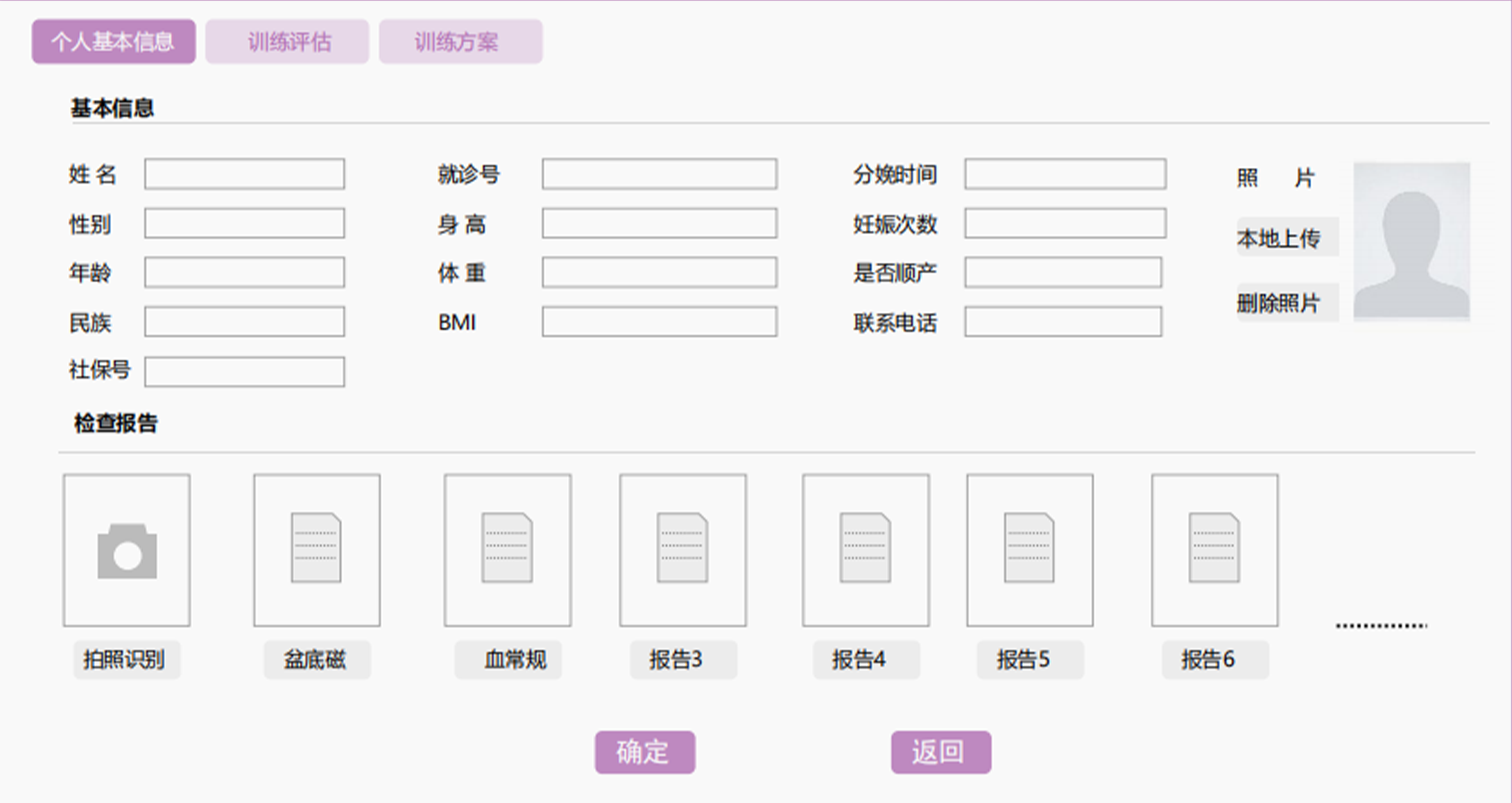 对用户的个人信息进行录入保存,也可采集其他的检查评估报告,建立档案,同时进行评估测试并根据评估测试结果进行运动处方的设定。