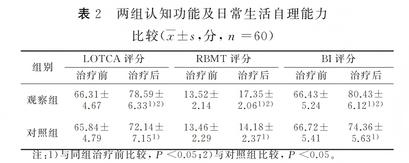对照组患者的洛文斯顿认知功能评定量表(LOTCA)评分从 65.84 分提升至 72.14 分,Rivermead 行为记忆测验(RBMT)评分从 13.46 分提升至 14.18 分,巴塞尔指数(BI)评分从 66.72 分提升至 74.36 分;