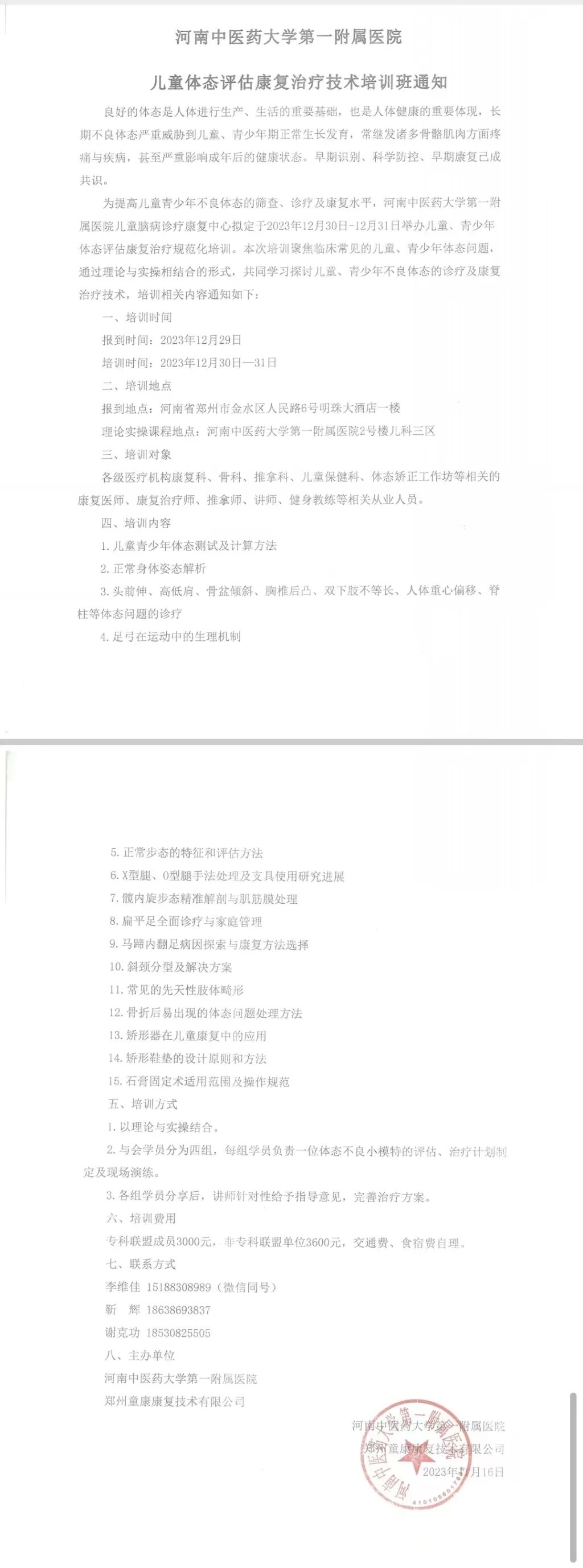 为提高儿童、青少年不良体态的筛查、诊疗及康复水平,河南中医药大学第一附属医院儿童脑病诊疗康复中心拟定于2023年12月30日-12月31日举办儿童、青少年体态评估康复治疗规范化培训。本次培训聚焦临床常见的儿童、青少年体态问题,通过理论与实操相结合的形式,共同学习探讨儿童、青少年不良体态的诊疗及康复治疗技术,培训相关内容通知如下: