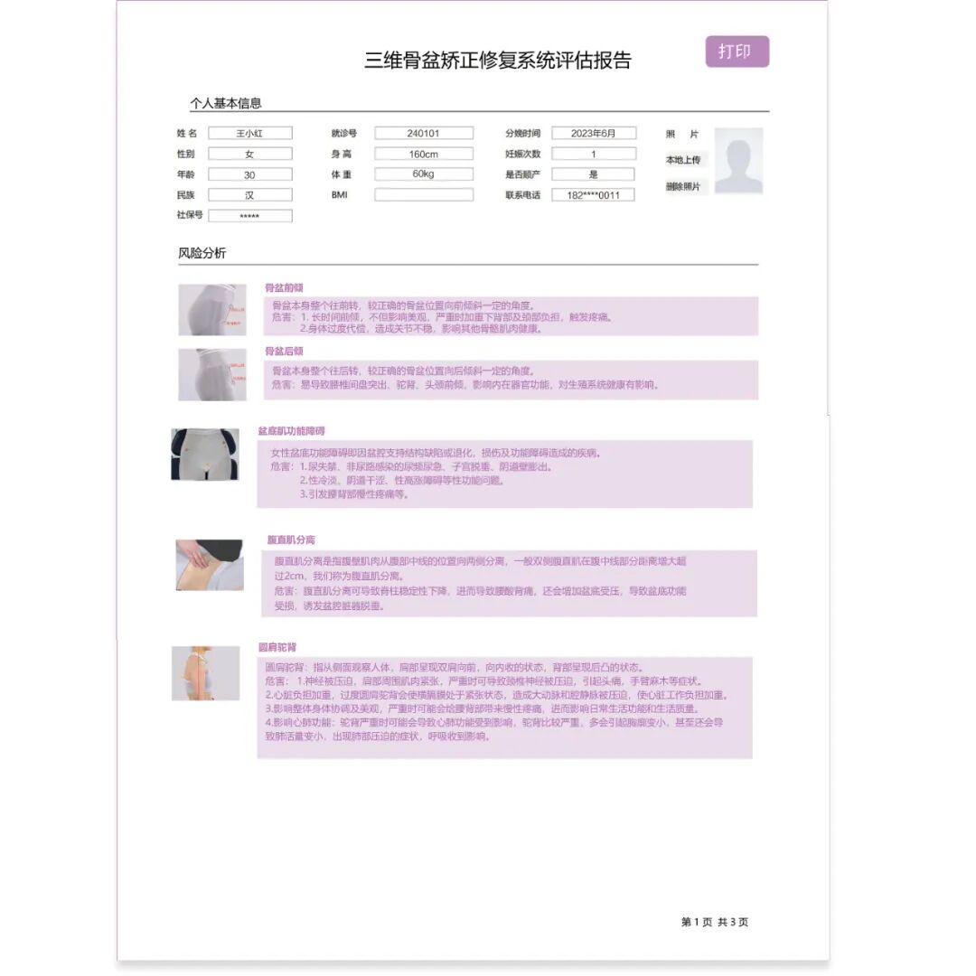 软件可指导临床操作人员对用户进行骨盆运动功能障碍评估、盆底肌功能障碍评估、腹直肌分离评估、姿势不良快速评估测试。