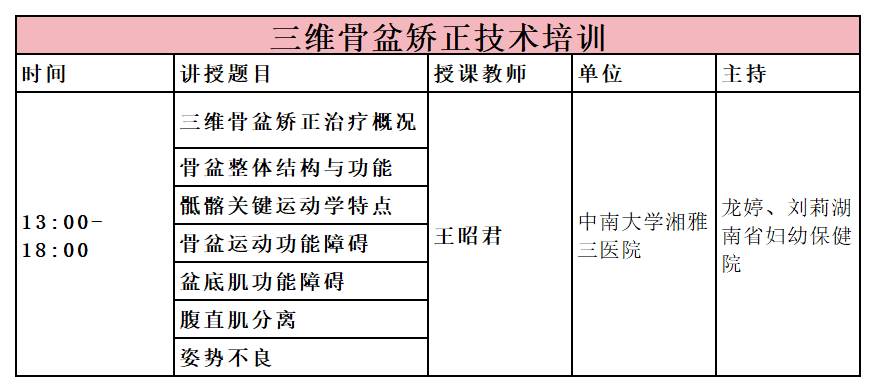 01 会议时间 2025年11月08-10日 02 会议地点 长沙北辰洲际酒店 酒店地址:湖南省长沙市开福区湘江北路三段1500号 联系电话:0731-89668866 03 主要内容 本次培训班分为主会场和分会场及女性盆底解剖培训班。 其主要内容见下: (一)盆底手术专题; (二)单孔及vNOTES专题; (三)盆底康复专题; (四)盆底手术演示; (五)女性盆底解剖培训班。 04 会议日程 05 三维骨盆矫正技术培训班 讲师介绍 王昭君 中国康复医学会运动治疗专业委员会 委员 湖南省孕产健康专业委员会副主委 湖南省脊柱骨伤康复专业委员会委员 湖南省运动治疗专业委员会⻘年委员 湖南省物理治疗专业委员会委员 智能体态分析系统 多维评估:三维人体体态,提供全面的体测数据,多维度评测健康风险。数据精确:检测系统依托用户大数据样本,通过高效的智能算法形成高质量的分析结果。 快速精准:系统将实时识别并自动标记人体45个骨性关键点,彻底告别手工瞄点时代。 直观易懂:评估结果以可视化图表形式输出,直观了解自身的体态问题。 科学灵活:支持“可手动修正自动识别的骨性关键点”,从而确保测试的准确性及个性化。 智能处方:根据检测结果实时匹配个性化运动处方,指导科学运动。 三维骨盆矫正修复系统 三维骨盆矫正修复系统是基于人体行走的步态模式而设计的左右交替倾斜运动模式的设备。可以引起两侧骨盆的交替倾斜同行走时的模式相似,而且速度更快。当振动达到一定频率时,肌肉开始产生牵张反射,能更好的锻炼肌肉间/肌肉内的协调性,激活从下肢到躯干的所有肌群,使全身肌群得到高效的训练。 评估测试: 产品功能: 骨盆运动功能障碍: 骨盆前倾、骨盆后倾、骨盆侧倾、骨盆旋转、髂骨分离、髂骨旋前、髂骨旋后、髂骨内收、髂骨外展、骶骨侧屈、耻骨联合分离。 盆底肌功能障碍: 盆底肌徒手肌力测试可大致反映盆底肌功能障碍程度;进一步确诊需专业医学检查,如盆底超声影像和盆底电生理检查。 腹直肌分离: 指腹壁肌肉从腹部中线的位置向两侧分离。 姿势不良: 肋骨外翻、圆肩驼背。 软件特点 1. 用户管理 对用户的个人信息进行录入保存,也可采集其他的检查评估报告,建立档案,同时进行评估测试并根据评估测试结果进行运动处方的设定。 2.评估测试 软件可指导临床操作人员对用户进行骨盆运动功能障碍评估、盆底肌功能障碍评估、腹直肌分离评估、姿势不良快速评估测试。 3.运动处方的选择 方案库中有多种运动处方,根据评估测试结果从方案库里进行处方选择;也可以在方案库中添加运动处方,根据用户实际情况对处方参数编辑调整,非常方便! 4.用户训练 训练过程中有视频动画、语音提示、文字描述等多维度指导,引导用户标准的完成动作训练。 5. 报告打印 训练完成后,可以针对本次的评估测试及训练打印相关报告,也可以打印历史记录报告。