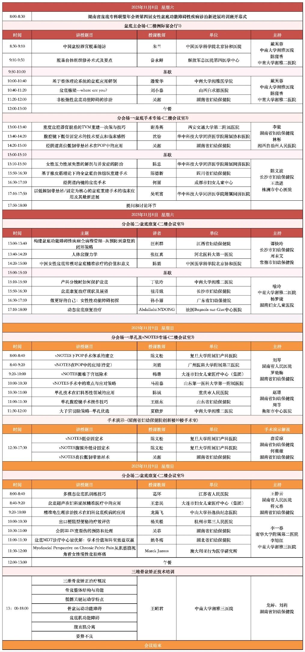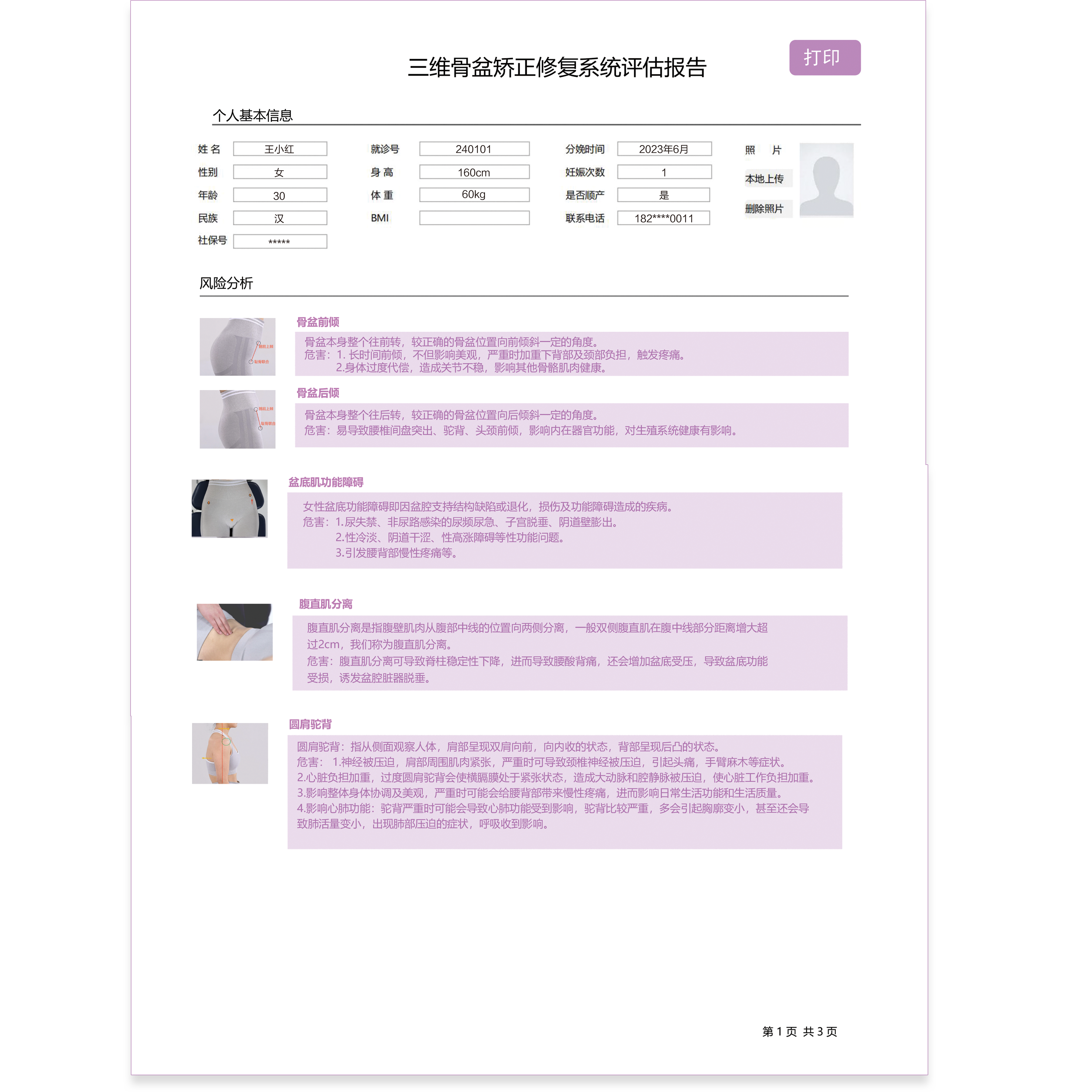 01 会议时间 2025年11月08-10日 02 会议地点 长沙北辰洲际酒店 酒店地址:湖南省长沙市开福区湘江北路三段1500号 联系电话:0731-89668866 03 主要内容 本次培训班分为主会场和分会场及女性盆底解剖培训班。 其主要内容见下: (一)盆底手术专题; (二)单孔及vNOTES专题; (三)盆底康复专题; (四)盆底手术演示; (五)女性盆底解剖培训班。 04 会议日程 05 三维骨盆矫正技术培训班 讲师介绍 王昭君 中国康复医学会运动治疗专业委员会 委员 湖南省孕产健康专业委员会副主委 湖南省脊柱骨伤康复专业委员会委员 湖南省运动治疗专业委员会⻘年委员 湖南省物理治疗专业委员会委员 智能体态分析系统 多维评估:三维人体体态,提供全面的体测数据,多维度评测健康风险。数据精确:检测系统依托用户大数据样本,通过高效的智能算法形成高质量的分析结果。 快速精准:系统将实时识别并自动标记人体45个骨性关键点,彻底告别手工瞄点时代。 直观易懂:评估结果以可视化图表形式输出,直观了解自身的体态问题。 科学灵活:支持“可手动修正自动识别的骨性关键点”,从而确保测试的准确性及个性化。 智能处方:根据检测结果实时匹配个性化运动处方,指导科学运动。 三维骨盆矫正修复系统 三维骨盆矫正修复系统是基于人体行走的步态模式而设计的左右交替倾斜运动模式的设备。可以引起两侧骨盆的交替倾斜同行走时的模式相似,而且速度更快。当振动达到一定频率时,肌肉开始产生牵张反射,能更好的锻炼肌肉间/肌肉内的协调性,激活从下肢到躯干的所有肌群,使全身肌群得到高效的训练。 评估测试: 产品功能: 骨盆运动功能障碍: 骨盆前倾、骨盆后倾、骨盆侧倾、骨盆旋转、髂骨分离、髂骨旋前、髂骨旋后、髂骨内收、髂骨外展、骶骨侧屈、耻骨联合分离。 盆底肌功能障碍: 盆底肌徒手肌力测试可大致反映盆底肌功能障碍程度;进一步确诊需专业医学检查,如盆底超声影像和盆底电生理检查。 腹直肌分离: 指腹壁肌肉从腹部中线的位置向两侧分离。 姿势不良: 肋骨外翻、圆肩驼背。 软件特点 1. 用户管理 对用户的个人信息进行录入保存,也可采集其他的检查评估报告,建立档案,同时进行评估测试并根据评估测试结果进行运动处方的设定。 2.评估测试 软件可指导临床操作人员对用户进行骨盆运动功能障碍评估、盆底肌功能障碍评估、腹直肌分离评估、姿势不良快速评估测试。 3.运动处方的选择 方案库中有多种运动处方,根据评估测试结果从方案库里进行处方选择;也可以在方案库中添加运动处方,根据用户实际情况对处方参数编辑调整,非常方便! 4.用户训练 训练过程中有视频动画、语音提示、文字描述等多维度指导,引导用户标准的完成动作训练。 5. 报告打印 训练完成后,可以针对本次的评估测试及训练打印相关报告,也可以打印历史记录报告。
