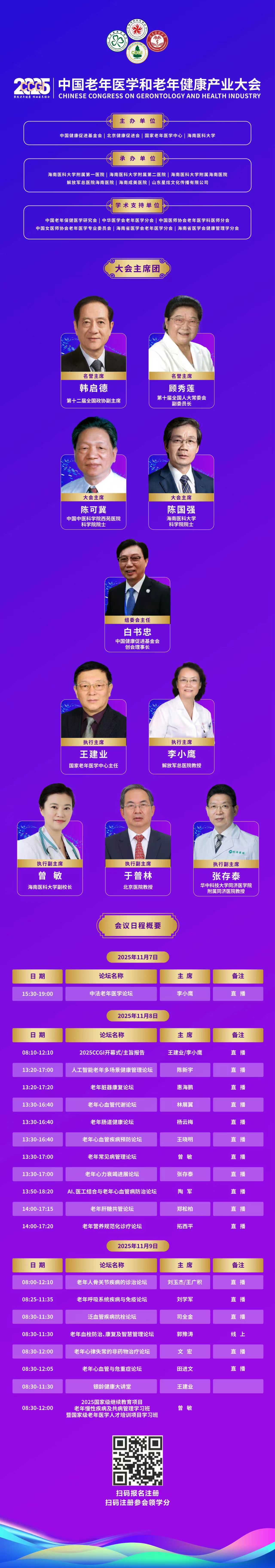 大会拟开设近30个专业分论坛;根据会议主题和热门话题,拟组织多场圆桌会议;会议召开间隙开展以“提高健康管理意识,促进老年健康”为主题的2025年老年健康宣传活动(健康大讲堂)。