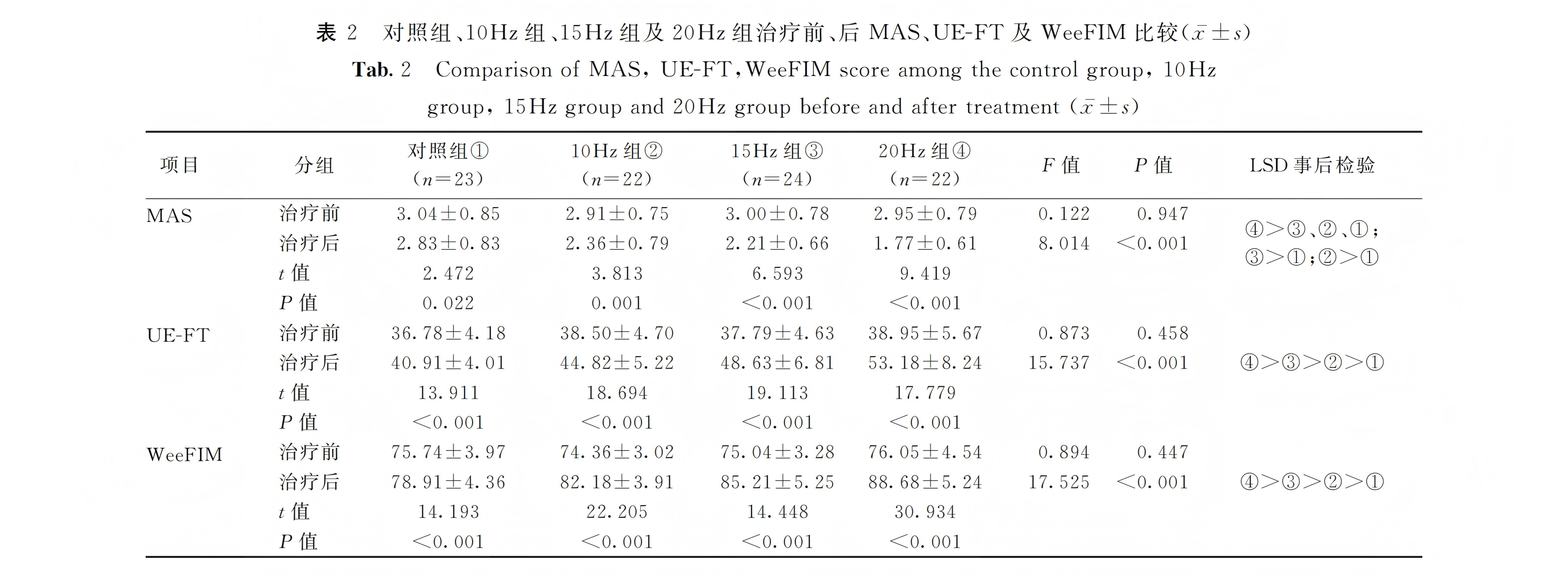 经过 6 周的治疗,各组患儿的康复效果呈现出清晰的差异,整体来看,三个振动组的各项指标均优于单纯接受常规康复训练的对照组,而不同频率之间也存在明显区别: