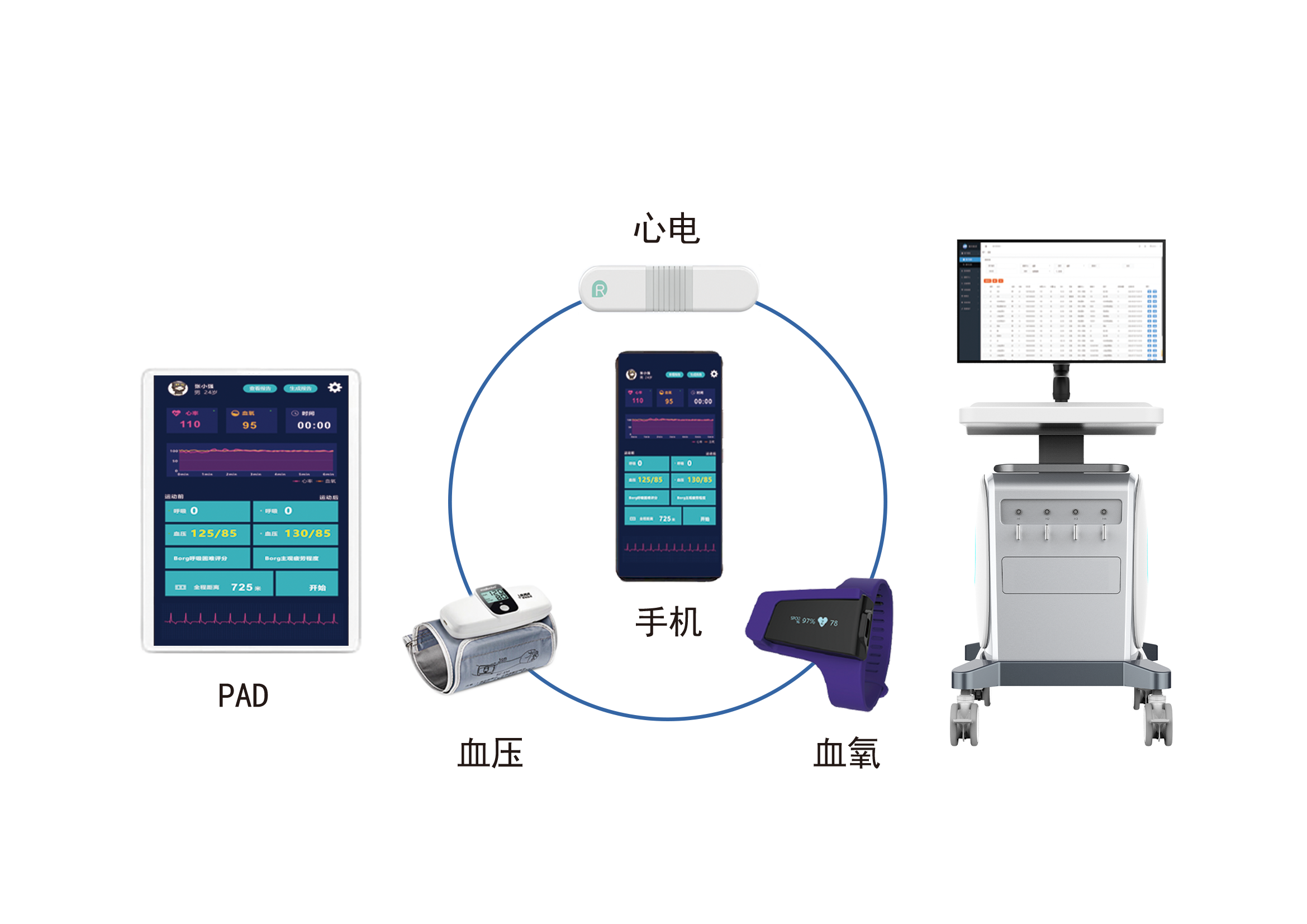 六分钟步行试验(6MWT)主要用于评价中、重度心肺疾病患者的治疗疗效,另外还可用于评价患者基础运动功能情况,患者采用徒步运动方式,通过无线通讯方式实时监测心电、血压、血氧,从而得出评估结果。